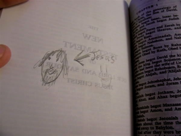 So, like a young child with a new pack of crayons and a blank pad of paper, I went to work. I mostly doodled random stuff, but I also crossed out the title page where it says "Holy Bible", and wrote "Book of Magic." Anybody want to see my Jesus??